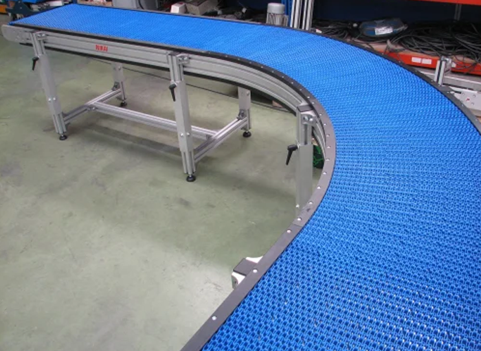 The 90 degree bend can be implemented with a minimum turning radius of width involved. Roller conveyors at 90 degree bends can be designed with PU rope, chains for both tapered rollers and plain rollers. Systems have been developed to take turn at 1.5 times the belt width for modular belt conveyors. Special attachments like corner disc and magnetic corner track can be used for special applications in slat chain conveyors.