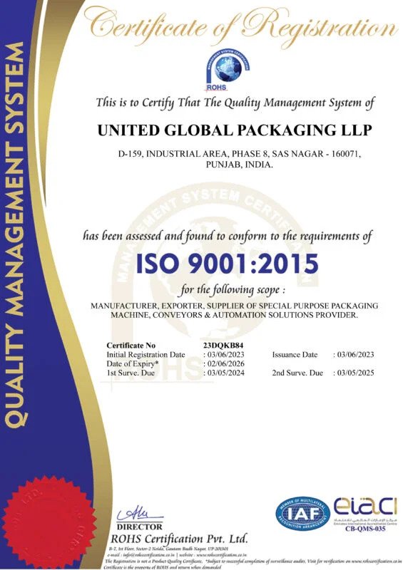UGP (Customized Packaging machine manufacturer and Automation solutions provider) proudly holds ISO 9001:2015 certification, demonstrating our commitment to maintaining the highest standards of quality management. As an ISO 9001:2015 certified company, UGP adheres to the following key principles: