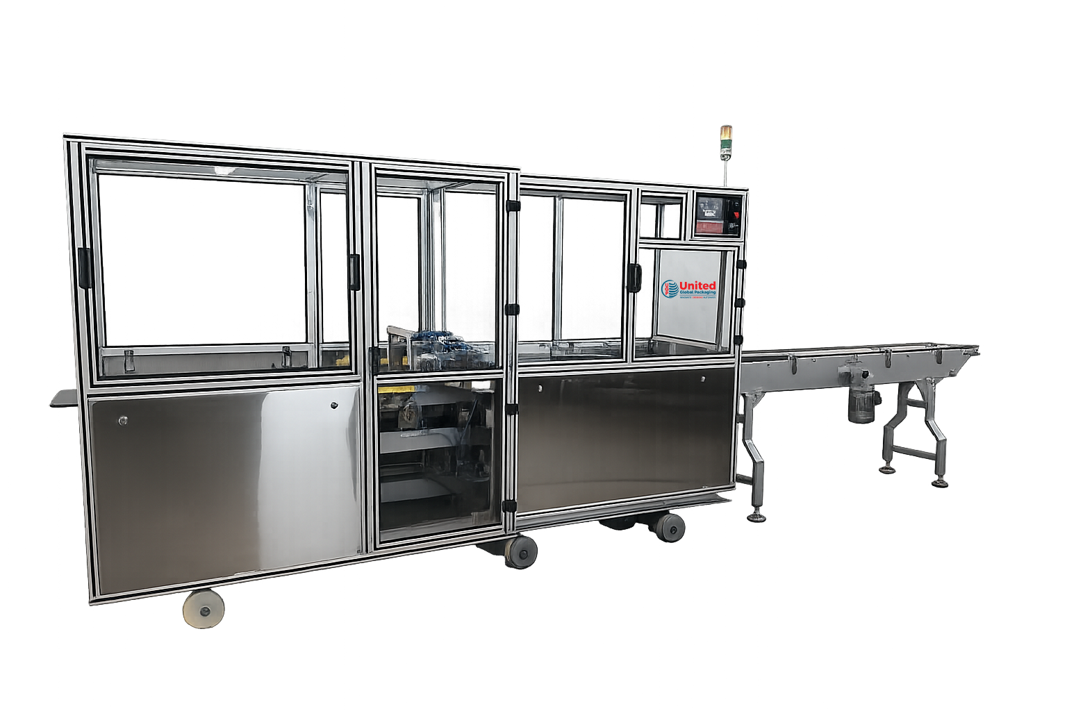 UGP7300 CTM Soap bar collating and promotional band making Machine with adhesive tape on sides for making band of 1x2,1x3, 1x4,1x5 soaps/band PLC interface for Tape cut length control through HMI. Collating and promotional banding machine that automatically collates desired number of paper overwrapped/ carton soap bar in up-right position resting on thickness of Product and then applies printed adhesive tape on both sides. Infeed conveyor of the machine is linked to the discharge belt of the Paper overwrapping machine or cartoning machine. Product sensors and PLC interface buffer conveyor keep sufficient No of soap bar on the infeed conveyor of the machine. The machine can operate at high speed (160-250 ppm) to match output speeds of most wrapping machines in direct link-up with it. Design of machine allows easy and fast changeover with minimal change parts.